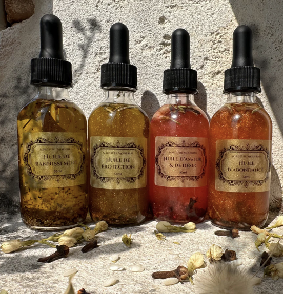 - Ancrage des intentions : En appliquant des huiles directement sur le corps, elles permettent de lier l’intention du rituel Ă soi-mĂŞme, offrant une connexion plus profonde et personnelle avec l’Ă©nergie du sortilège.