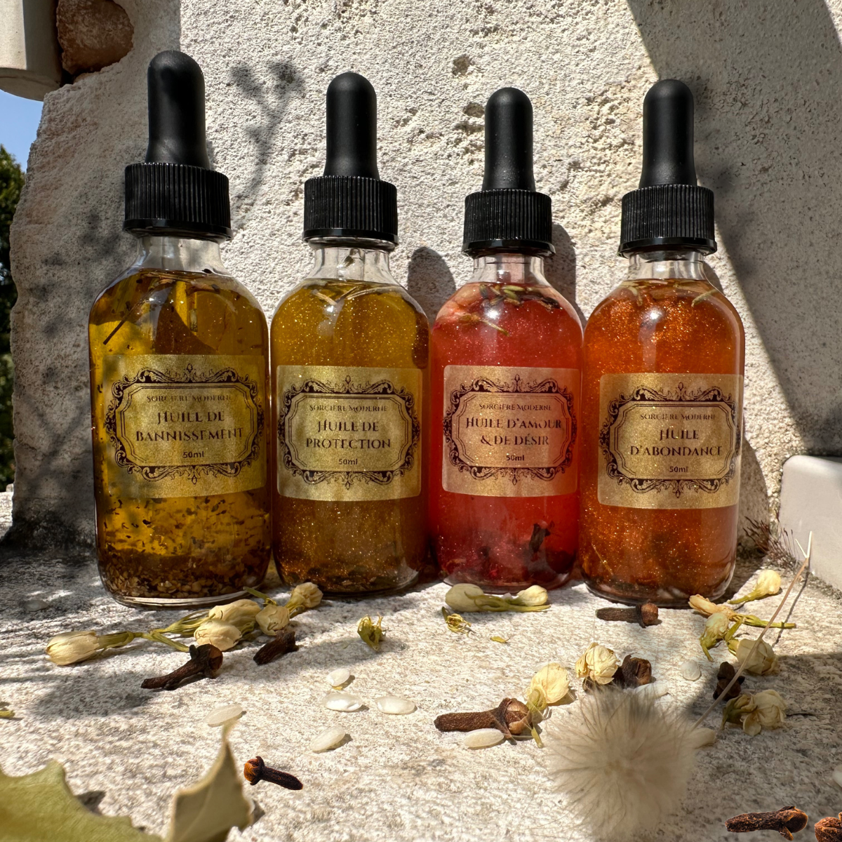 Découvrez notre kit exclusif de 4 huiles magiques, conçu pour vous offrir protection, bannissement des énergies négatives, abondance et amour – tout ce dont vous avez besoin pour harmoniser et enrichir votre pratique magique.
